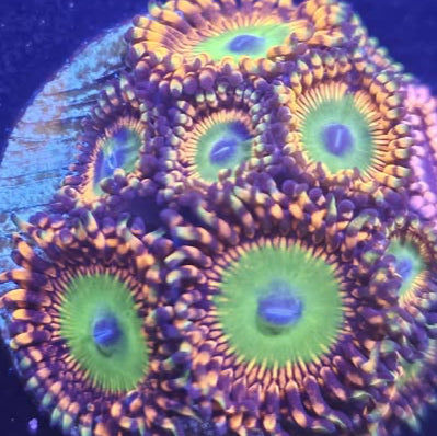 Le Zoanthus Candy Apple est une souche classique et très recherchée de zoanthide, réputée pour ses couleurs vives rappelant un bonbon acidulé. Ses polypes dévoilent un centre vert néon éclatant, entouré d’un anneau rouge/orangé intense et mis en valeur par des tentacules verts fluorescents. Cet effet bicolore très contrasté en fait une pièce incontournable dans un jardin de zoas.