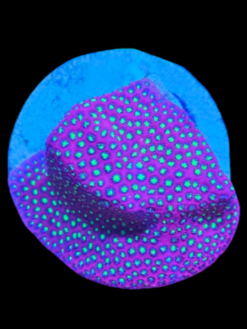 L’Electric Daisy Stylo est un corail SPS vibrant, reconnaissable à ses polypes ultra-fluo jaunes, verts ou dorés sur une base sombre ou violette. Ce contraste intense lui donne un effet "pollen électrique", spectaculaire sous éclairage actinique. Sa croissance en plaques ou en monticules ajoute une texture vivante au décor récifal.