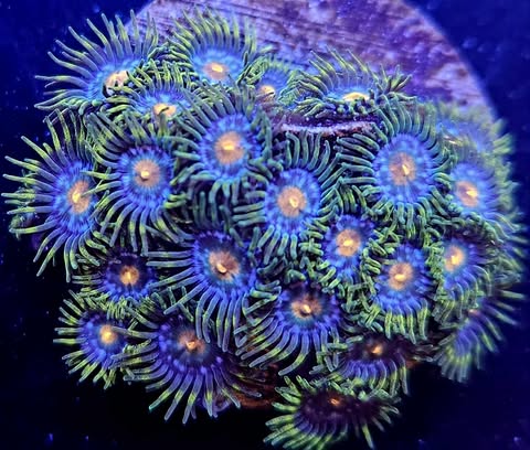 Le Zoanthus Eye of Rah est un zoa fascinant qui brille par son contraste unique. Son centre orange pâle illumine chaque polype, entouré d’un disque bleu intense qui fait ressortir ses tentacules d’un vert éclatant. Ce jeu de couleurs en fait une pièce incontournable pour tout jardin de zoas, rappelant l’énergie et la puissance de l’« Œil de Râ ».