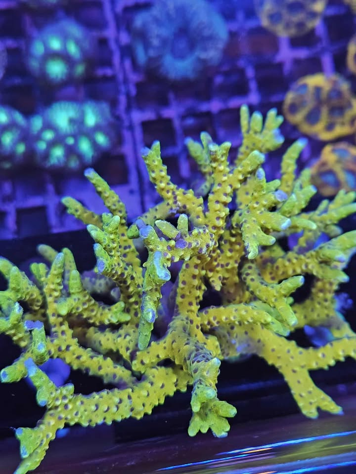 Le Golden Rod Anacropora est un corail SPS unique et lumineux, avec des branches fines et allongées d’un jaune doré à jaune verdâtre, créant un effet vibrant sous lumière bleue. Sa structure délicate mais dense donne du volume et une texture élégante à la partie supérieure du décor.