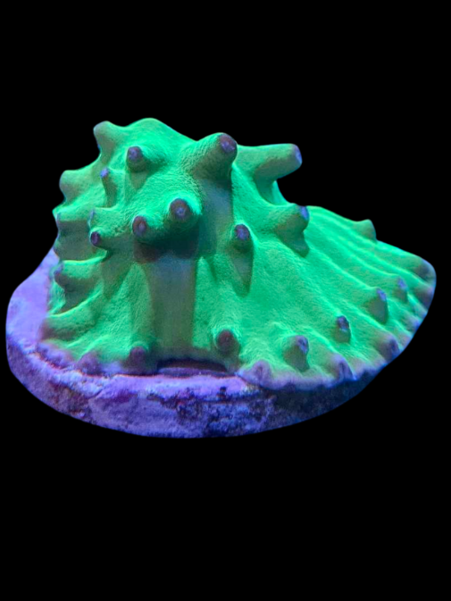 Le Cyphastrea branchu vert est une variété unique de ce corail habituellement encroutant. Il forme de petites branches épaisses recouvertes de polypes verts fluo, offrant à la fois structure et brillance dans l’aquarium récifal. Son apparence originale le distingue nettement des autres LPS ou SPS.