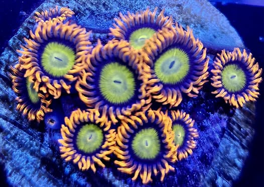Son centre jaune lumineux est entouré d’un disque mauve profond, mis en valeur par des polypes orange vifs qui apportent une touche flamboyante. Ce mélange original en fait une pièce remarquable dans tout jardin de zoas