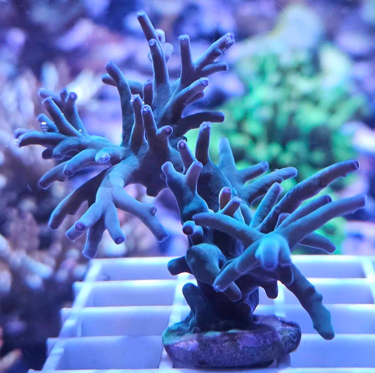 Sa couleur est d’un bleu profond et vibrant, souvent rehaussée de nuances turquoises ou vertes selon l’éclairage et la chimie de l’eau. C’est un véritable bijou pour tout aquarium récifal, apportant une touche de contraste saisissante parmi les autres coraux.
