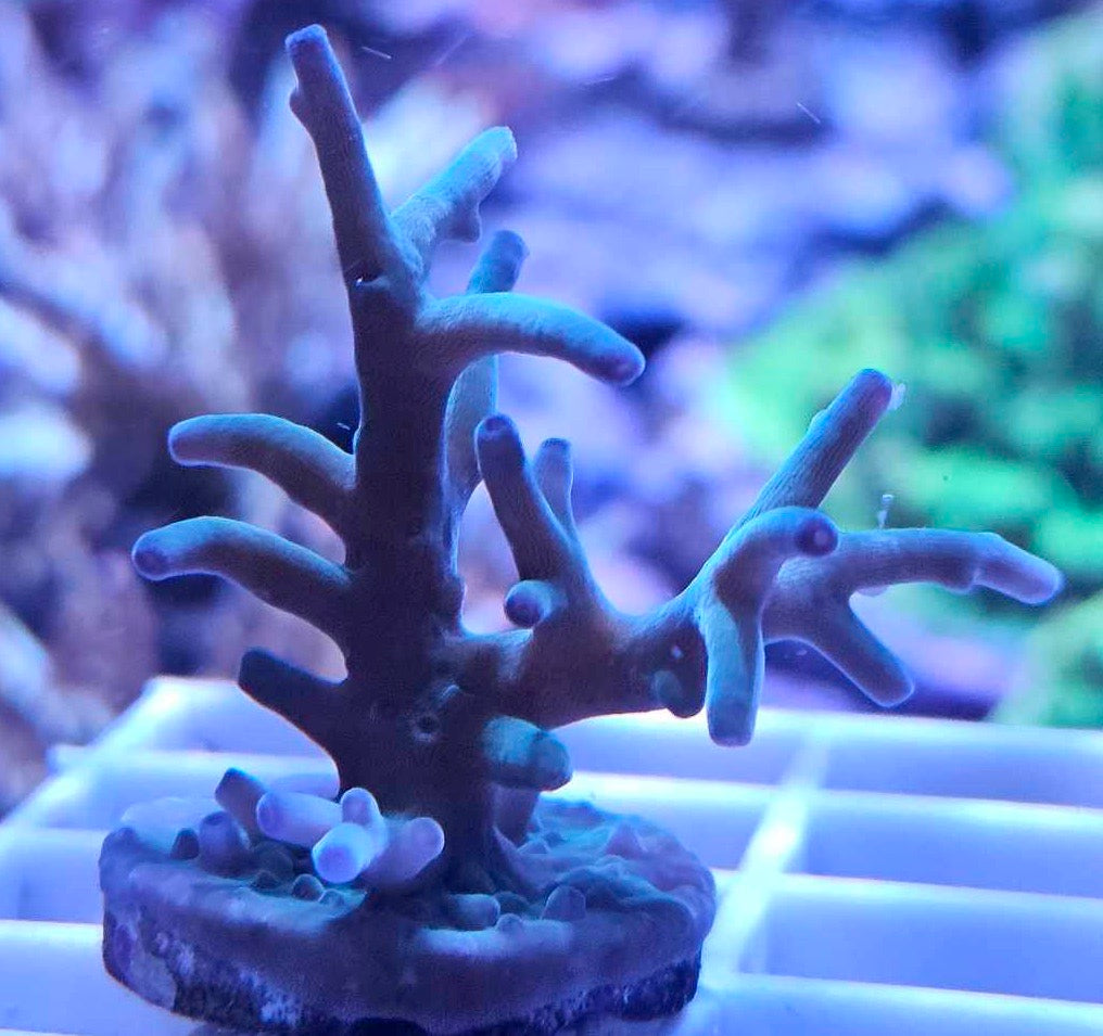 Ce corail SPS (Small Polyp Stony) se distingue par ses branches fines et allongées, couvertes de polypes serrés, qui lui donnent une texture délicate et raffinée.