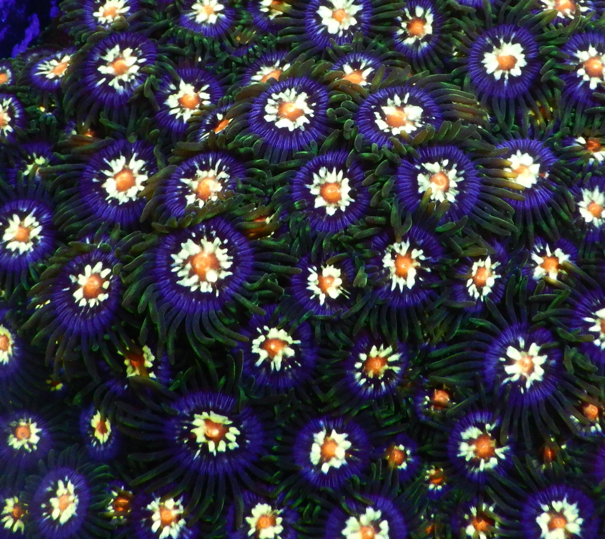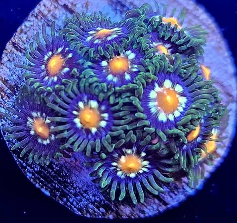 Le Pinwheel Zoanthus est un zoanthide fascinant, avec des polypes qui arborent un motif rappelant une roue à rayons (pinwheel), combinant des couleurs vives comme le jaune, orange, et parfois un halo violet ou rose autour du disque central. Ce dessin dynamique apporte un effet visuel tournoyant et captivant dans l’aquarium.