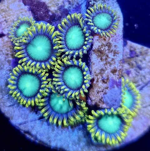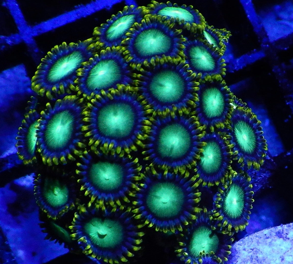 Le Zoanthus Radioactive Dragon Eye est une variété légendaire de zoa, reconnue pour ses couleurs éclatantes qui rappellent l’énergie radioactive. Ses polypes présentent un centre vert néon intense entouré d’un disque plus sombre, souvent vert foncé à brun, avec des tentacules fluorescents d’un vert électrique. L’effet visuel est puissant et lumineux, parfait pour dynamiser un jardin de zoanthides.