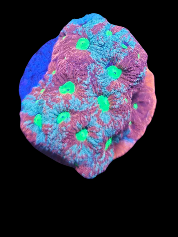 Une base rouge vif contrastée par des yeux verts fluo, formant un motif de guerre visuelle dans l’aquarium. Sa structure en relief et ses couleurs éclatantes en font un excellent choix pour dynamiser les zones basses du bac.