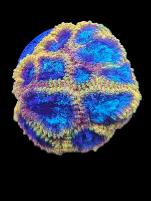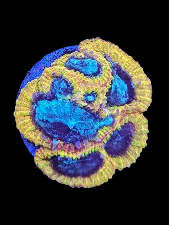 Le Yellow Submarine Favia est un corail LPS spectaculaire aux yeux jaune fluo éclatants, souvent cerclés de rouge, violet ou orange, sur une base sombre qui accentue les contrastes. Ce motif unique évoque les couleurs vives et funky d’un sous-marin psychédélique, d’où son nom.